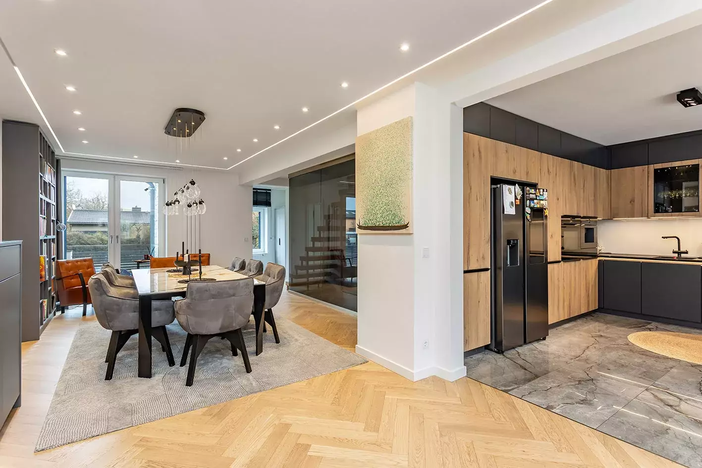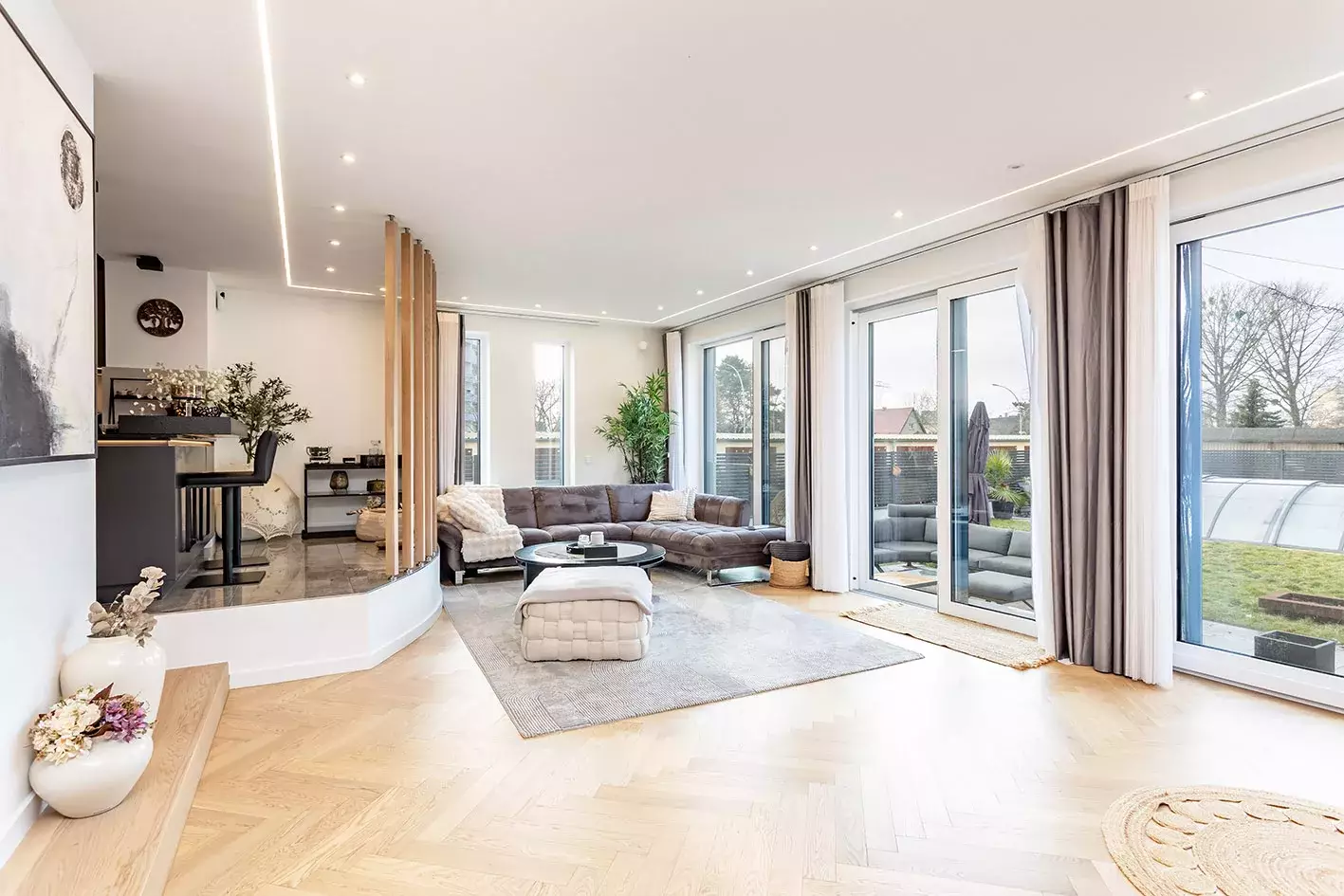 Der offen gestaltete Wohn- und Essbereich bildet das Herzstück des Erdgeschosses. Großzügige Raumhöhen, integrierte LED-Lichtlinien, hochwertige Einbauspots sowie edles Echtholz-Fischgrätenparkett sorgen für ein modernes und zugleich wohnliches Ambiente. Bodentiefe Fensterflächen verbinden den Innenraum fließend mit der Terrasse und dem Garten. Die offene Einbauküche überzeugt durch griffloses Design, edle Materialkombinationen, eine großzügige Kochinsel und hochwertige Einbaugeräte. Sie ist funktional durchdacht und gleichzeitig kommunikativer Mittelpunkt des Hauses. Im Obergeschoss erwarten Sie ein großzügiges Schlafzimmer mit Ankleide und Bad en suite, modern ausgestattet mit Dusche und Doppelwaschbecken, sowie weitere flexibel nutzbare Zimmer und ein zusätzliches Badezimmer mit Dusche und Badewanne. Helle Räume und klare Linien setzen sich hier konsequent fort. Der Vollkeller bietet mit Sauna und Fitnessraum zusätzlichen Wohnkomfort. Technisch ist das Haus bestens ausgestattet mit neuer Gasheizung (2024), Solaranlage, erneuertem Dach und neuer Treppenanlage. Der Außenbereich ergänzt das hochwertige Gesamtbild perfekt: Terrasse, gepflegter Garten und ein beheizter Pool mit Wärmepumpe schaffen ein privates Rückzugsrefugium. Eine Garage für zwei Fahrzeuge rundet dieses exklusive Angebot ab.